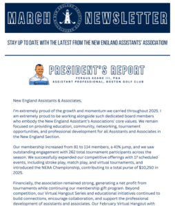 The New England Assistants Association is a subsidiary of the New England Section with an overall mission of establishing a unique culture amongst all assistants by combining educational programs with a competitive tournament series. The Association’s main focus is to foster an environment that will allow assistants to constantly grow professionally in hopes of obtaining a future head golf professional role.